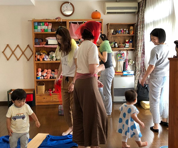1歳過ぎたお子さんたちはシフォンで遊んだり、青い布の川に板をわたして橋に見立て“どんどんばしわたれ”と歌いながら、お散歩したり。